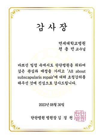 대한정형외과학회, 대한 견주관절의학회, 세브란스 관절경 연구회, 연세대학교 의과대학 정형외과학 교실에서 좋은 연구 업적으로 수상하였습니다.