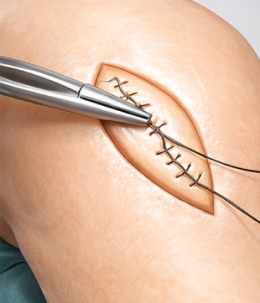4봉합후 마무리 한다. 줄기세포가 더 질이 좋은 연골(유리연골 유사 조직)을 형성하도록 도와준다.